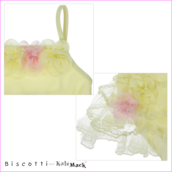 ペールイエローのボディの胸元とチュールスカートに お花のついた、キュートなスイムスーツ! お花とチュールの繊細さと、ソフトで甘い雰囲気が ステキな一品です♪